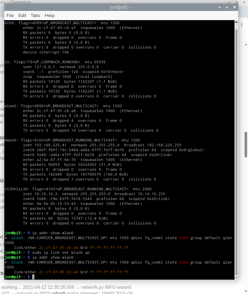 My wlan0 disappeared after getting the 4G modem working. I ran sudo ip link set wlan0 up, which made it show up in ifconfig (it wasn’t before). I tried but the status is still down (as seen in the img).